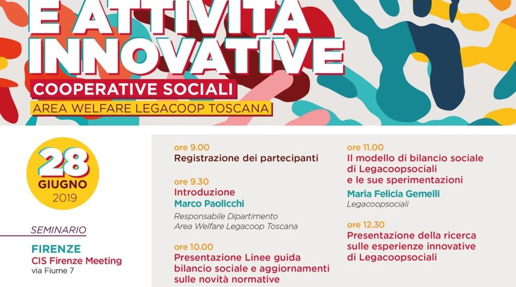 Venerdì 28 giugno si svolgerà al CIS Meeting di Firenze (via Fiume, 7) il seminario “Bilancio sociale e attività innovative”, organizzato dal Dipartimento Area Welfare Legacoop Toscana in collaborazione con Legacoopsociali, a cui parteciperà anche la presidente nazionale di Legacoopsociali Eleonora Vanni.