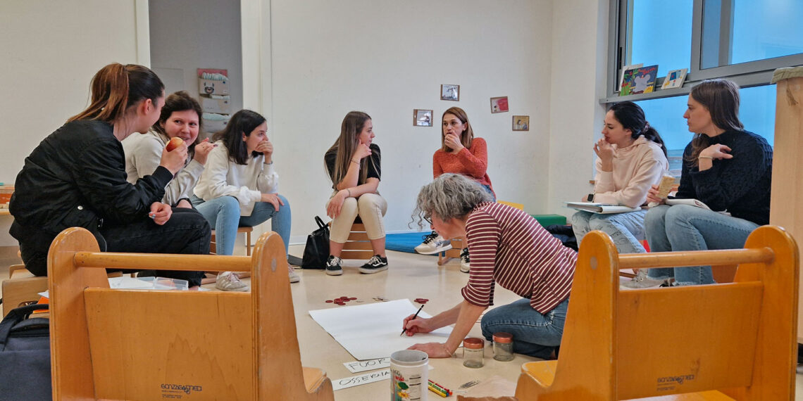 In tutto sono circa quaranta le persone, provenienti da sei Nidi d’Infanzia, che da marzo 2024 stanno partecipando al ciclo di incontri dedicato al “fuori” con l’obiettivo di osservare con uno sguardo diverso lo spazio all’aperto di quattro strutture campione della fascia 0-3: “Piccola Oasi” di Jesi, “Tingolo” di Castelbellino, “Nuvole di cotone” di Pesaro e “Nido dei Paperi” di Cartoceto.